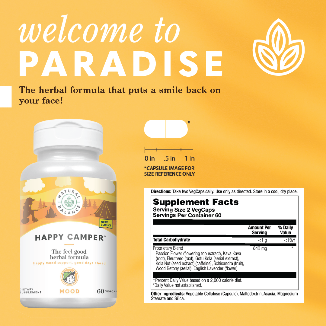 - Feel-Good Support Formula: Each of the ingredients in Happy Camper is thought to help support a different aspect of your mood so you can enjoy an overall sense of wellbeing.