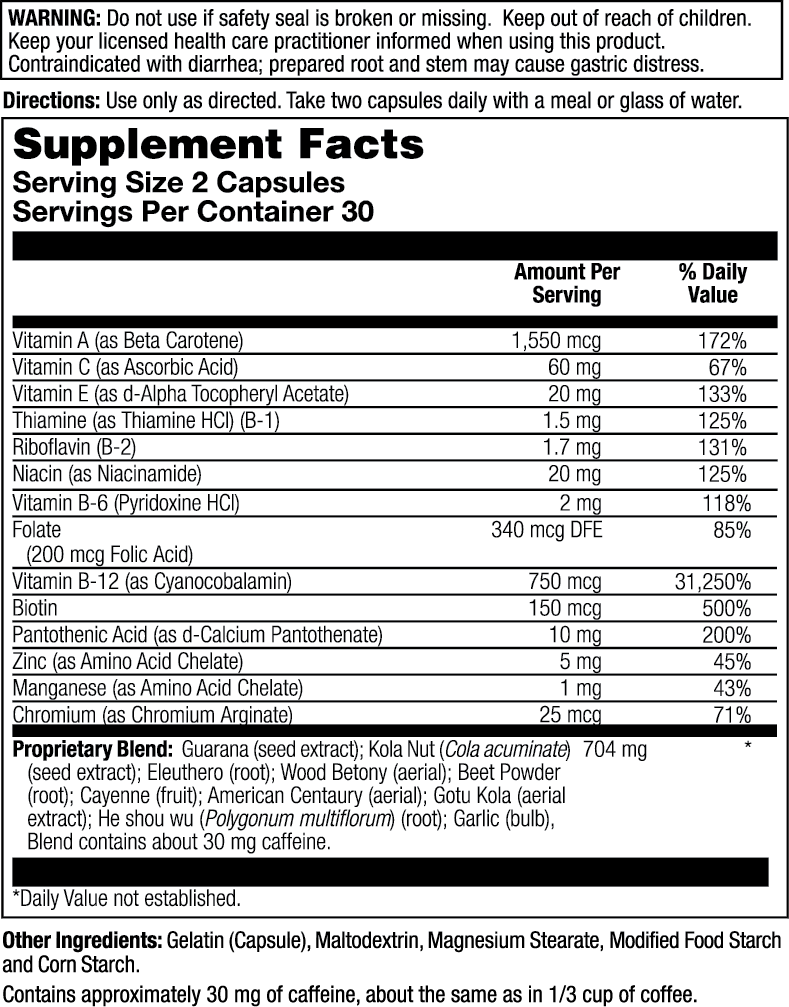 The unique Super Pep blend of herbs, vitamins and mineral helps to sustain energy and support vitality and stamina. A blend of Eleuthero, Kola Nut and other true-tested energizing herbs, along with special energy-enhancing vitamins and minerals, helps give you a quick energy boost while supporting your energy needs throughout the day.